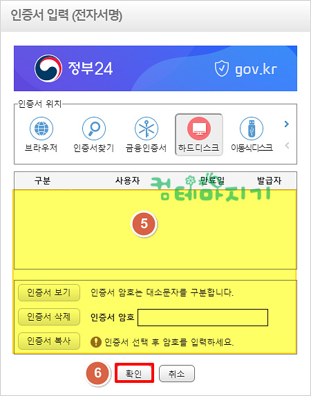 ▼ 인증서 입력 화면에서 [5. 인증서 선택 / 인증서 암호 입력]을 한 다음, [6. 확인]을 클릭합니다.