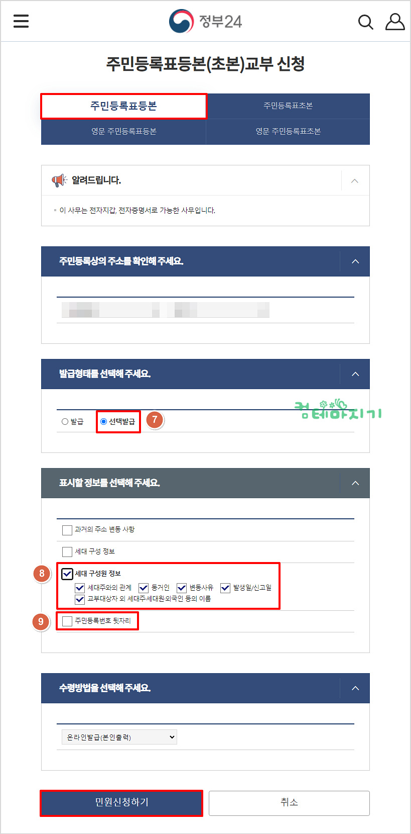 ▼ 주민등록표등본(초본)교부 신청 화면에서 [주민등록표등본] > [7. 선택발급]을 선택한 다음, [8. 세대 구성원 정보]를 체크합니다. [9. 주민등록번호 뒷자리]는 체크를 안해야 (*)문자로 처리됩니다.(주의)
