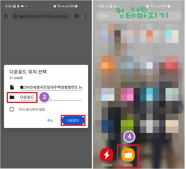 ▼ 다운로드 위치 선택화면에서 [3. 다운로드]위치를 기억합니다. 내 스마트폰에서 다운로드 폴더에서 방금 다운로드한 파일을 확인하기 위해서 [4. 내파일]어플을 터치합니다.(여기서 내파일 어플은 단순하기는 하지만, PC에서 탐색기와 같습니다. 스마트폰에 기본으로 설치된 파일관리 어플입니다.)