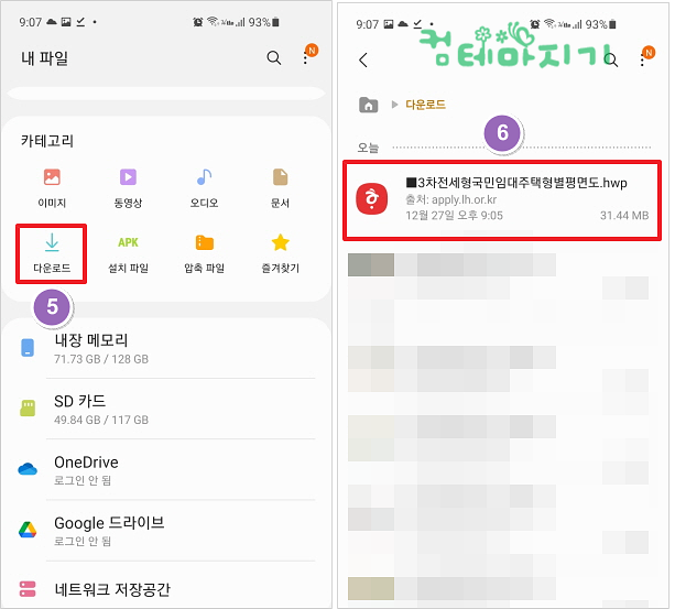 ▼ 내 파일 화면에서 [5. 다운로드]를 터치합니다. 다운로드 폴더안에 다운로드한 [6. 한글파일]이 있습니다.