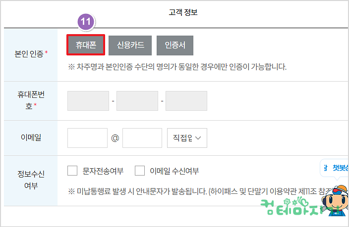 ▼ 고객정보 화면에서 본인 확인을 위한 휴대폰/신용카드/인증서 중 하나를 이용, 본인 인증 [11. 휴대폰]을 진행합니다.