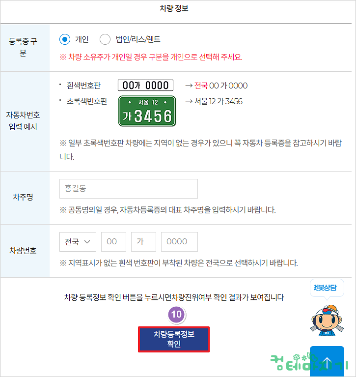 ▼ 차량정보 화면에서 등록증 구분>차주명>차량번호를 입력한 다음, [10. 차량등록정보 확인]을 클릭합니다.