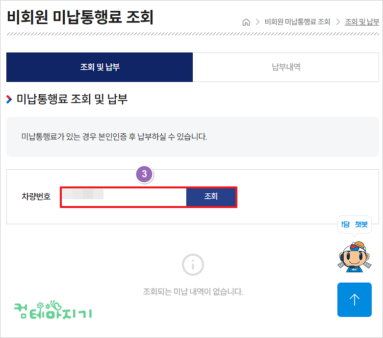 ▼ 조회 및 납부 화면에서 [3. 차량번호 조회]를 클릭하여 조회하면, 하단에 미납내역이 리스트되고, 본인 인증 후, 바로 납부가 가능합니다. 만일, 미납내역이 없다면 아래와 같이 미납내역 없슴 메시지를 확인 할 수 있습니다. 이시간에는 하이패스 미납요금 알아보는 방법에 대해서 알아보았습니다.