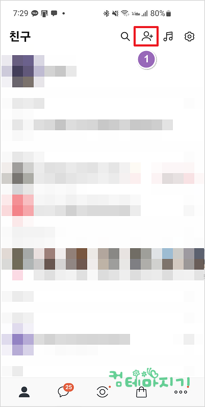 ▼ 카카오톡 하단 좌측 사람 아이콘을 터치한 다음, 상단 [1. 친구추가]를 터치한 다음, [2. ID로 추가]를 터치합니다.