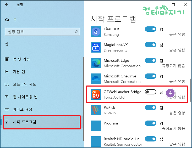 ▼ 설정 화면에서 [2. 시작 프로그램] > [3. OZweblauncher Bridge]가 켬인 상태입니다.