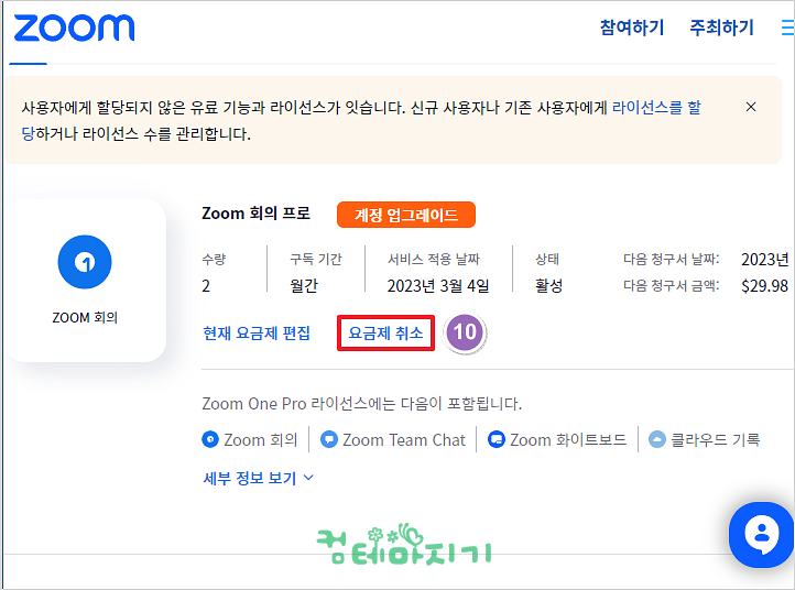 ▼ 가입 정보에서 유료인 줌(zoom) 회의 프로의 상태가 [취소됨]으로 바뀐 것을 확인합니다.