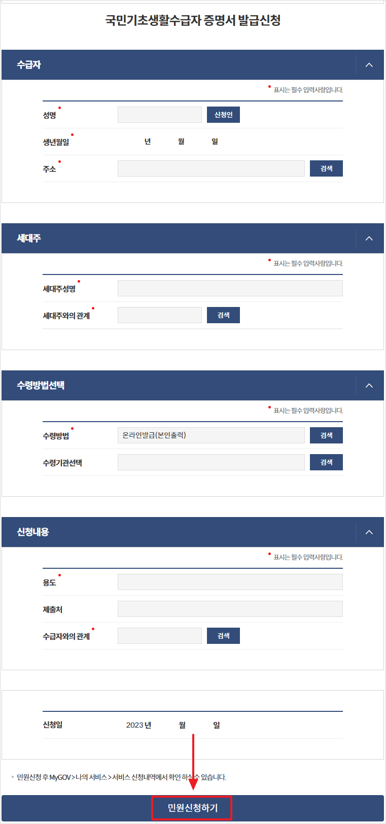 ▼ 국민기초생활수급자 증명서 발급신청서에 수급자/세대주/수령방법선택/신청내용을 모두 입력한 다음 [민원신청하기]를 클릭합니다.