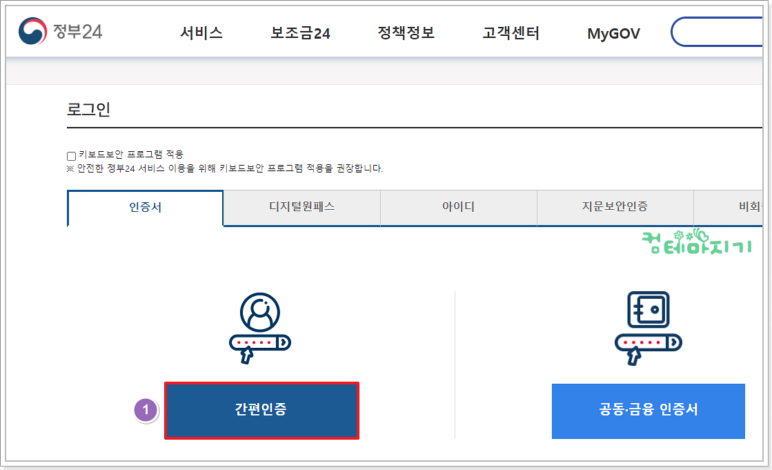▼ 정부24 홈에 접속해서, [1. 간편인증]을 클릭합니다.(또는 공동금융 인증서로 인증합니다.)