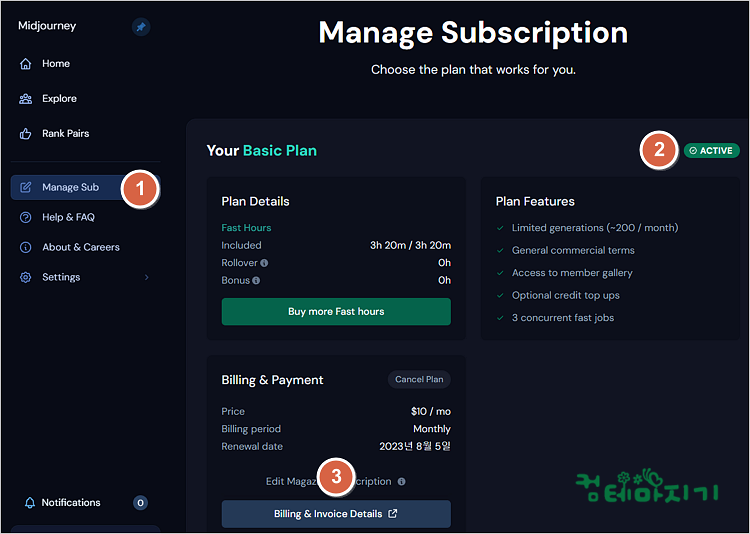 ▼ 좌측 미드저니 메뉴에서 [1. Manage Sub]를 선택하면, 가입상태 [2. ACTIVE] 이용중이 보입니다.