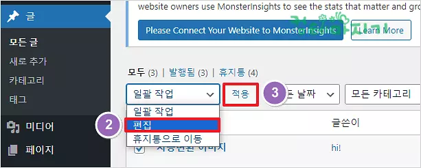 ▼ 글 리스트 상단 일괄 작업을 클릭한 다음, [2. 편집]을 선택, [3. 적용]을 클릭합니다.