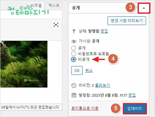 ▼ 오른쪽 화면에서 공개의 [3. 펼침아이콘]을 클릭하여, [4. 비공개]선택, [5. 업데이트]를 클릭합니다.