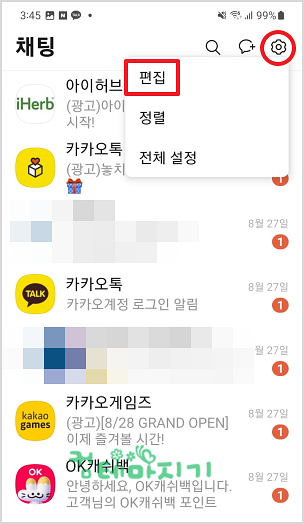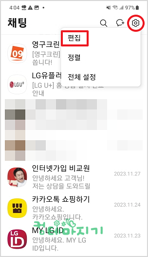 ▼ 원하지 않은 여러개의 대화방을 한꺼번에 나가기 위해, 오른쪽 상단 톱니바뀌 아이콘을 누른 다음, 메뉴에서 편집을 선택합니다.