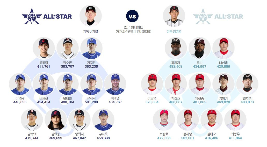 각 팀은 팬 투표와 선수단 투표를 통해 선정된 베스트12 선수들로 구성됩니다.이슈있수+5Korea Baseball+5연합뉴스+5