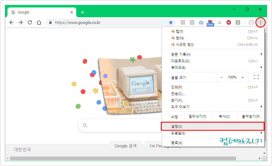 ▼ 우측상단 점세개 아이콘 클릭 > 메뉴 중 설정을 선택합니다.
