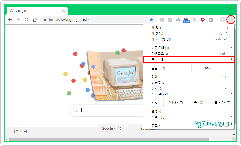 ▼ 서브메뉴 중에서 북마크바 표시(S)를 체크하면 표시, 체크를 풀면 제거입니다. 이때, 단축키를 사용하면 편리합니다. 북마크바 표시 단축키는 (Ctrl + Shift + B)입니다. 오른편에 표시되어 있습니다.