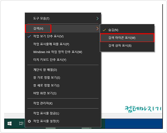 그러나, 작업표시줄이 복잡하니까 검색 아이콘만 표시하면 되겠죠?