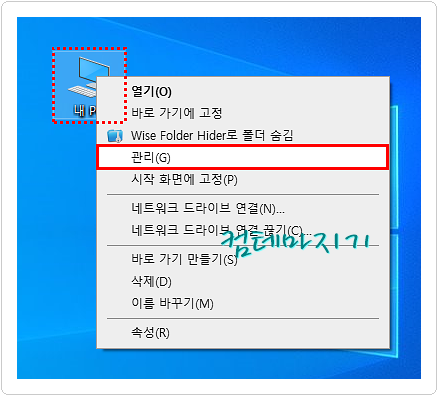 먼저, 네트워크드라이버가 관리되고 있는 장치관리자를 열기위해서, 바탕화면 내PC 아이콘에서 마우스 오른키 클릭한 다음, 메뉴 중에서 관리를 선택합니다.
