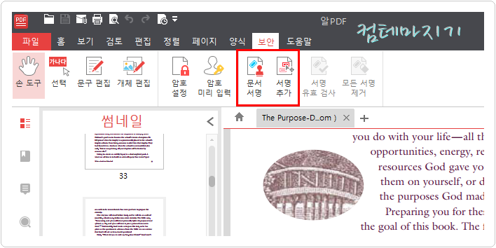 서명하고자 하는 문서를 열어서 서명하고자하는 페이지의 원하는 위치에 문서서명을 넣기위해서 알PDF의 상단 메뉴중 보안항목을 선택하면 아래, 문서서명과 서명추가가 나타납니다. 서명추가는 서명을 저장하며, 문서서명에서도 서명을 저장하여 사용할 수 있기 때문에 문서서명을 알아보겠습니다.