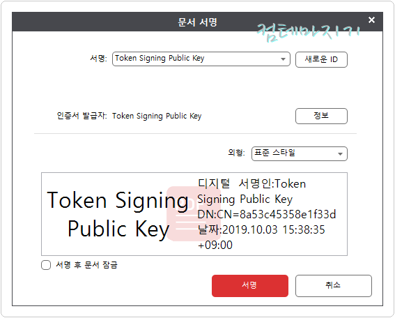 문서 서명화면에서 기본값 그대로 서명을 클릭합니다.