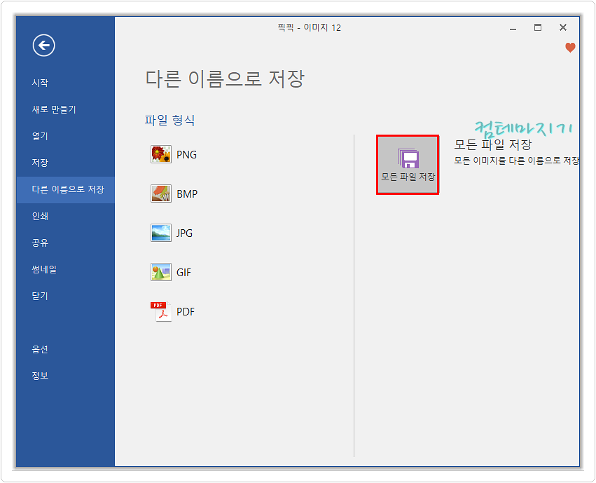 저장할 때, 파일 형식은 아래 화면과 같이 PNG, BMP, JPG, GIF, PDF 5가지 파일 형식이 지원됩니다. 동시에 모두 저장하기 위해서 오른쪽 모든 파일 저장을 클릭합니다.