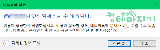 위와 같이 공유방법으로 세팅을 한 후에, 아래 네트워크 오류화면과 같이 메시지가 뜨면서 연결된 컴으로의 접근이 안된다면, 아래 방법을 따라서 해보시기 바랍니다.